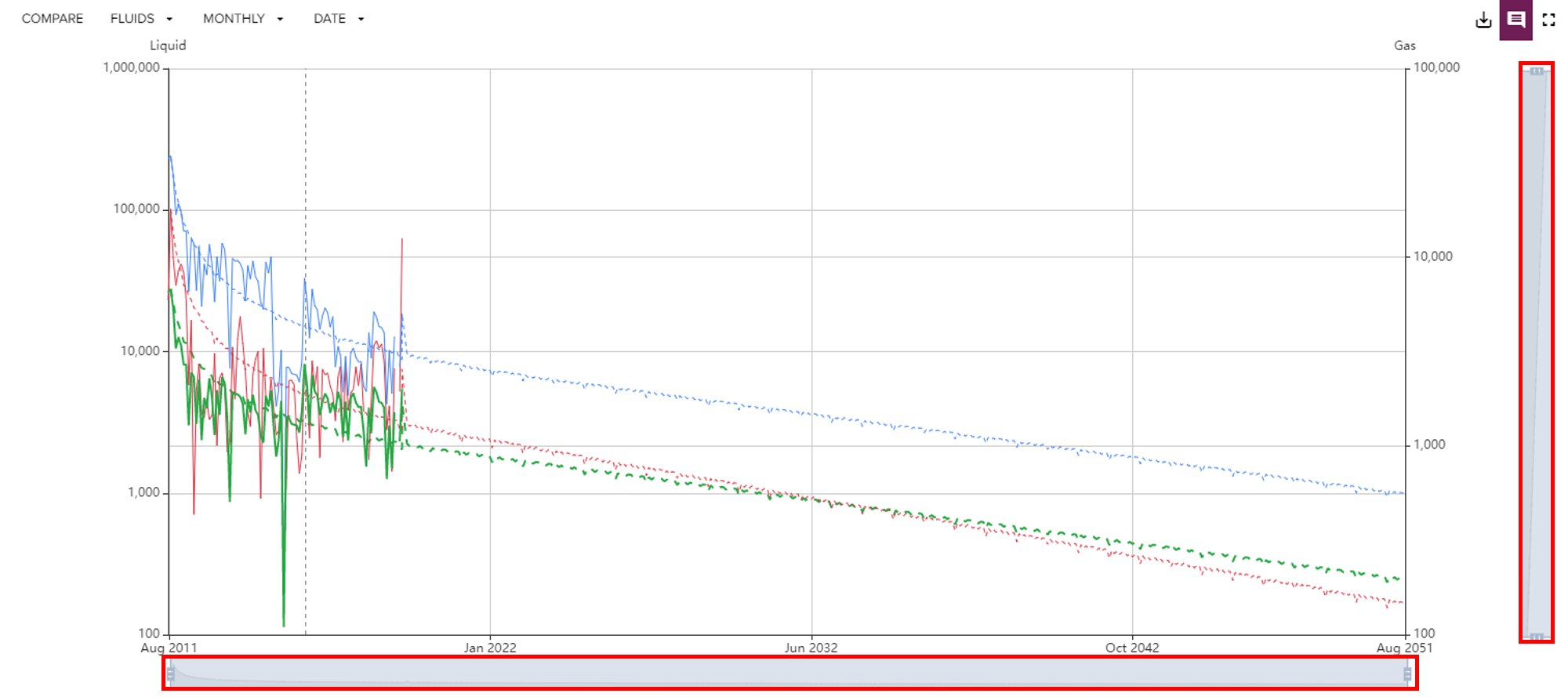 Use the Fluids Toggle to show or hide any streams that are available for the selected well. The fluid toggle can also be used to hide actual values or forecast curves.